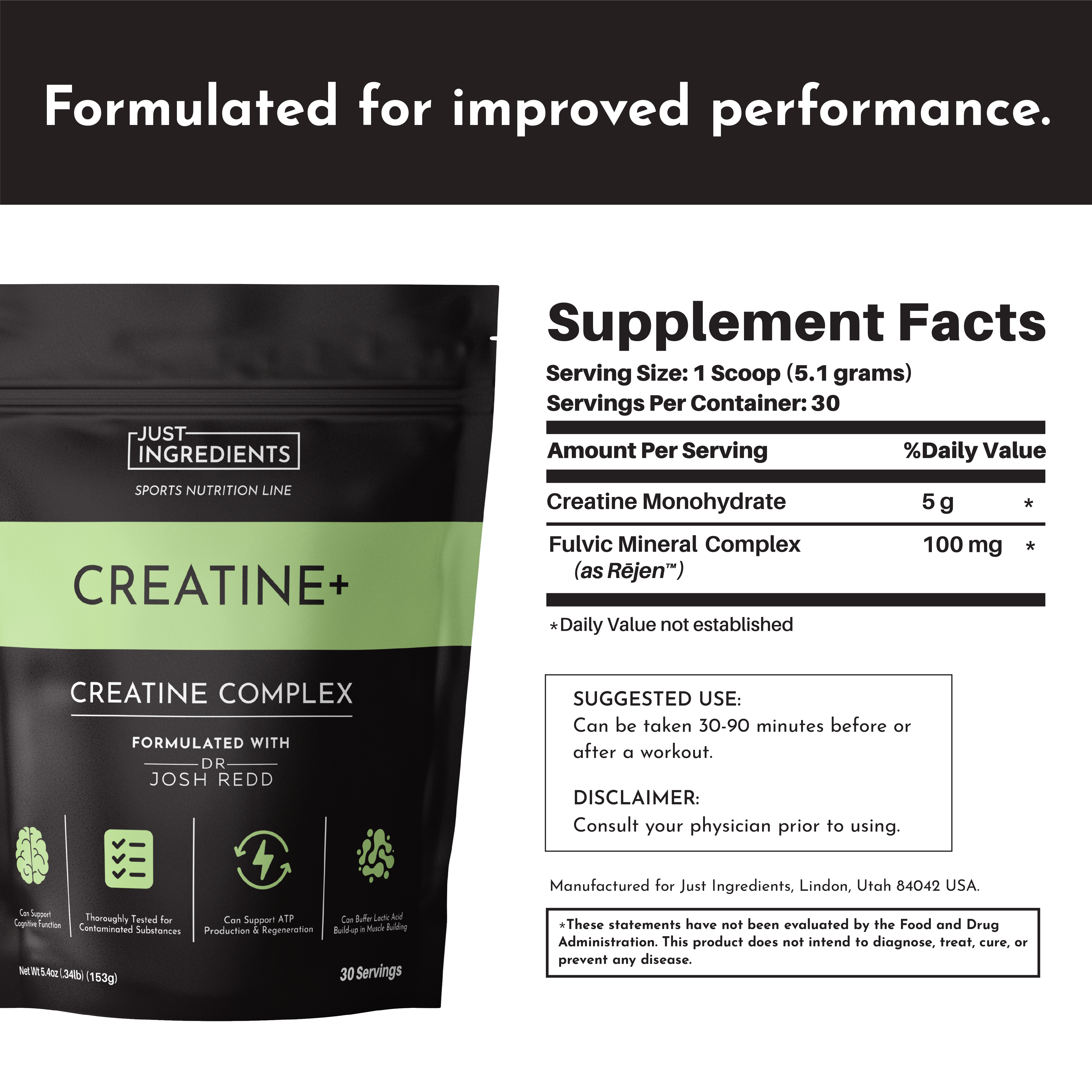 Just Ingredients Creatine+ is formulated to help support performance, muscle growth, recovery, and cognitive function—while helping replenish ATP, the body’s primary energy source during high-intensity exercise.* It features a premium form of creatine monohydrate known for its purity and is shown to contain no detectable DHT. We also include Rejen™ fulvic mineral complex, delivering 70+ trace minerals and supporting energy and ATP production.*