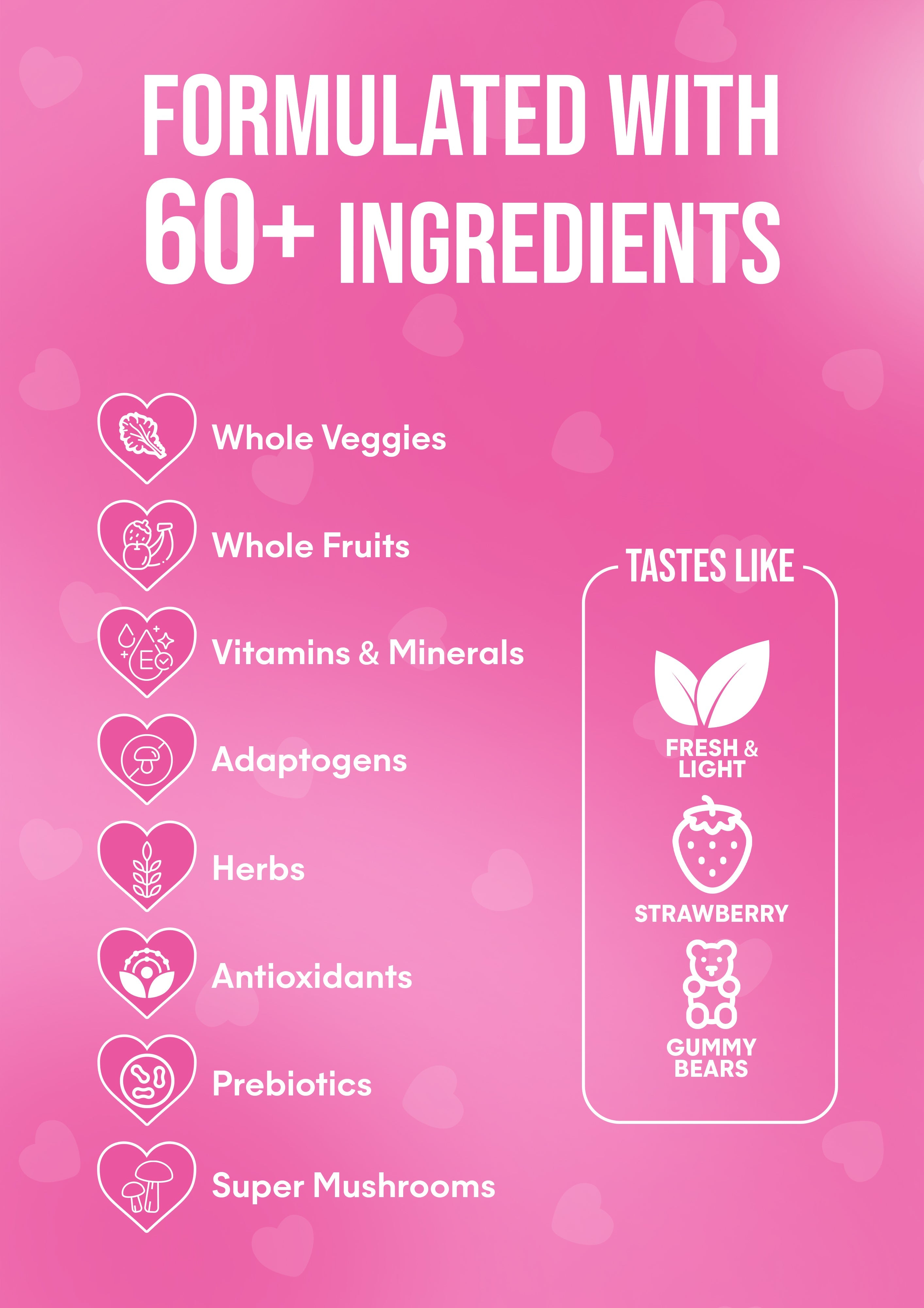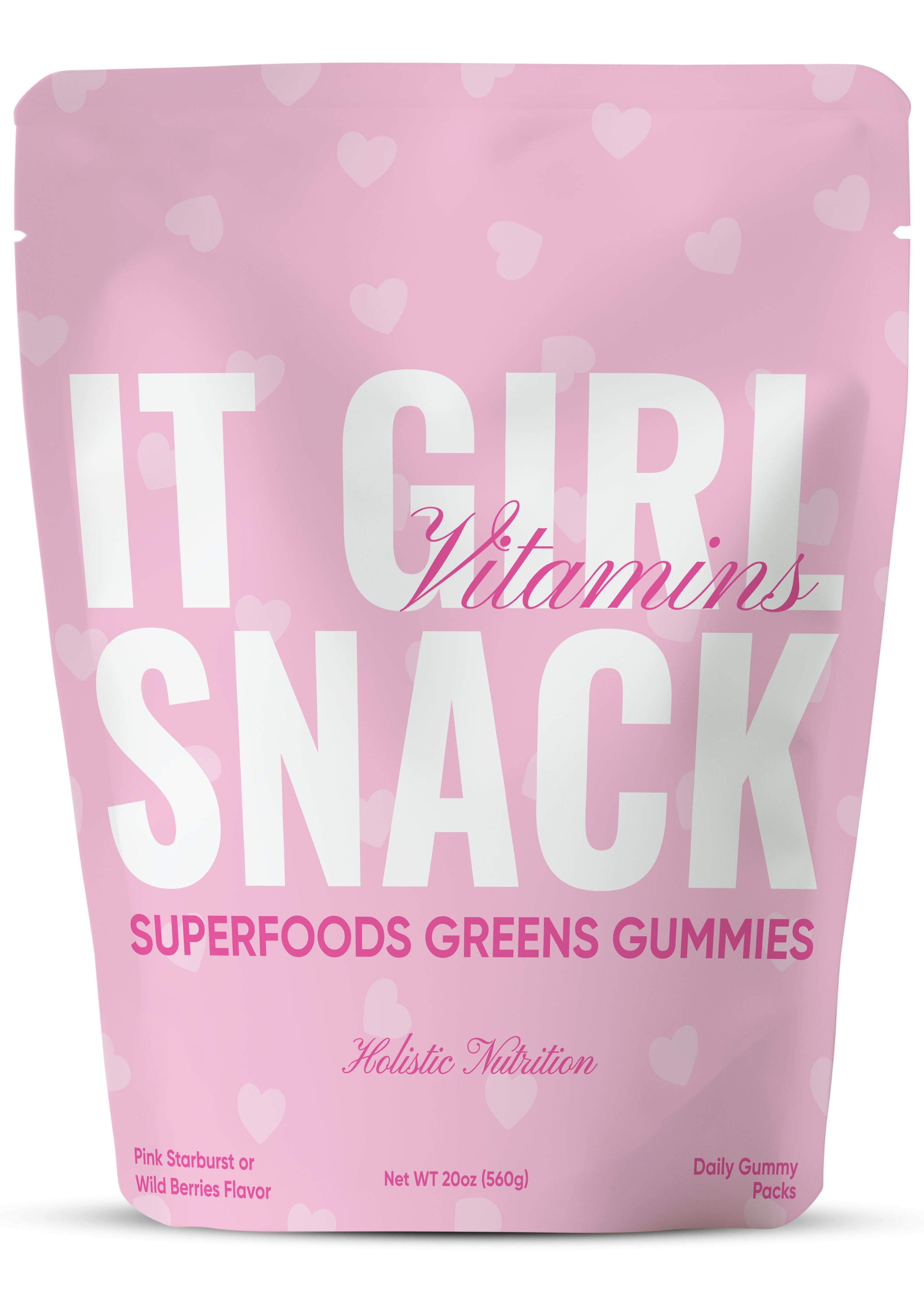 A delicious daily gummy that tastes like a Pink Starburst and supports your wellness from the inside out. It Girl Snack is a heart-shaped superfood gummy packed with over 60 plant-based ingredients including fruits, vegetables, vitamins, minerals, and greens.