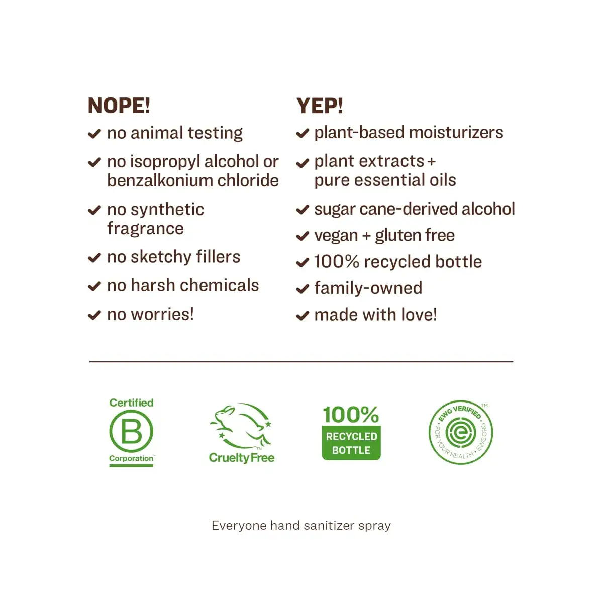 This plant-powered hand sanitizer spray uses sugar-cane-derived alcohol and pure essential oils to kill 99.9% of common germs while gently moisturizing with aloe and botanicals. Made without synthetic fragrances or harsh chemicals, it offers effective protection with a fresh, uplifting scent. Certified cruelty-free and vegan, plus gluten-free with recyclable packaging.