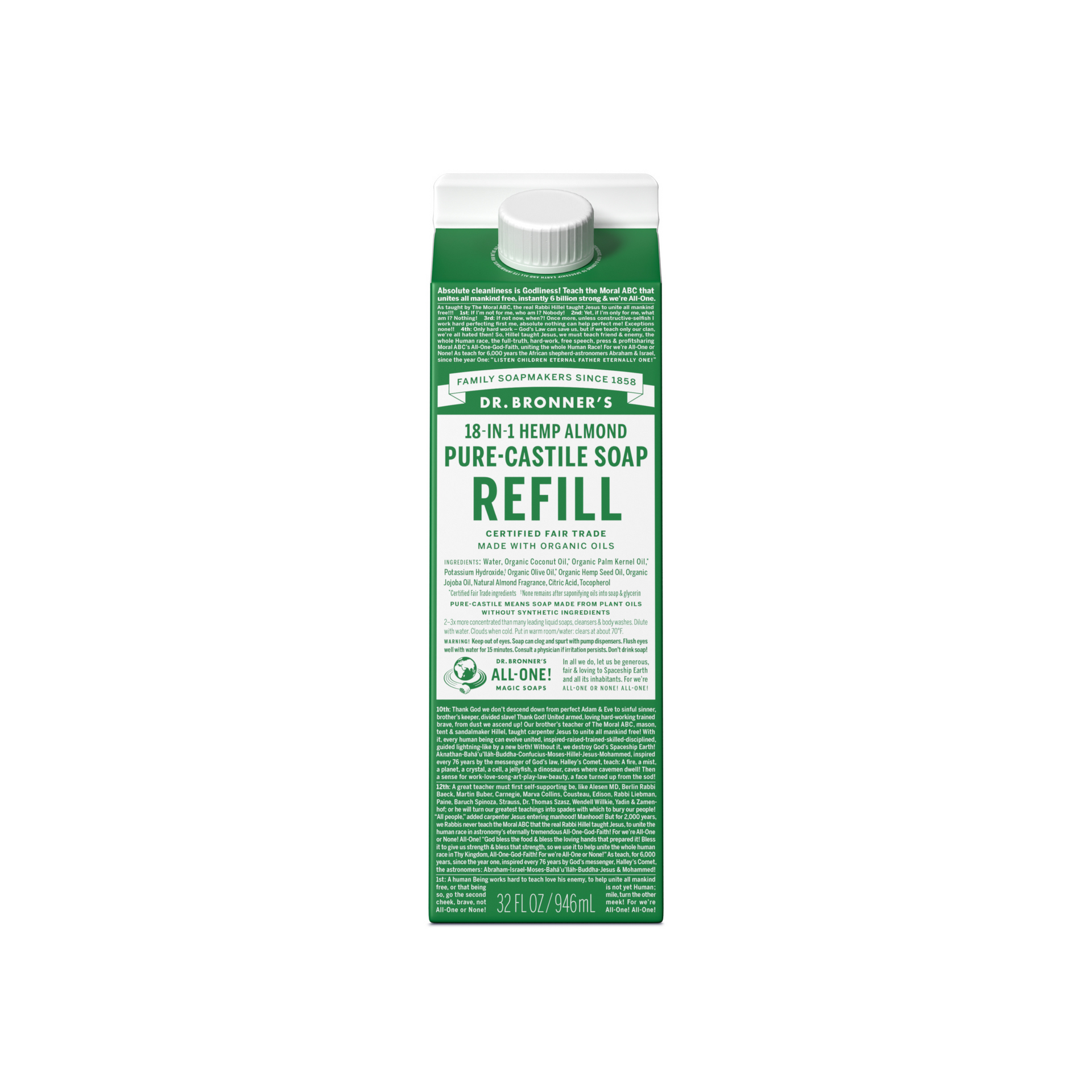 Refill your Dr. Bronner’s 100% Post-Consumer-Recycled bottle, all-purpose spray bottle, foaming pump dispenser, and more with our 32 oz. Soap Refill Paper Carton! Uses 82% less plastic than one of our 32 oz. recycled bottles! Sustainable made easy!