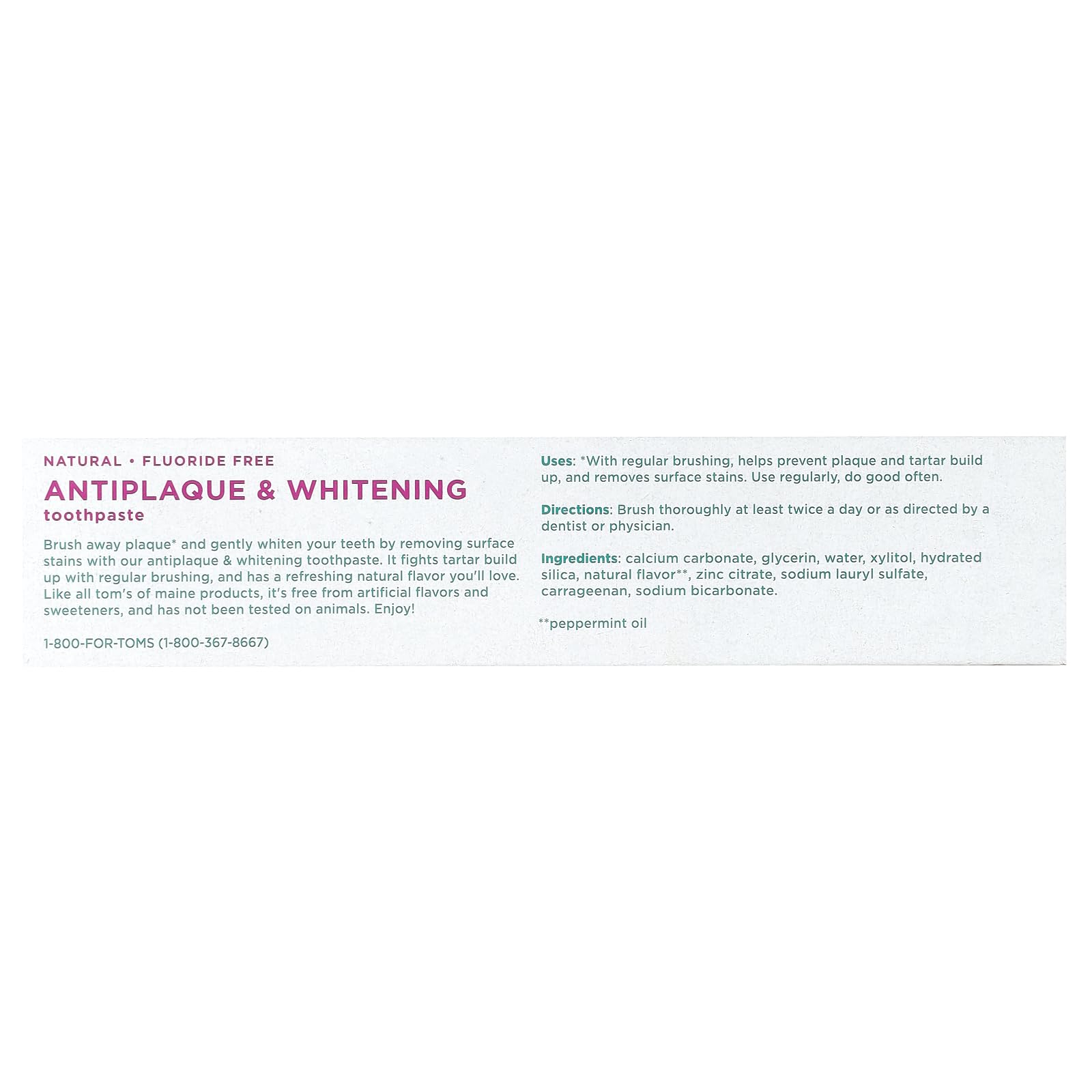 Calcium Carbonate, Glycerin, Water, Xylitol, Hydrated Silica, Natural Flavor (Peppermint Oil), Zinc Citrate, Sodium Lauryl Sulfate, Carrageenan, Sodium Bicarbonate.